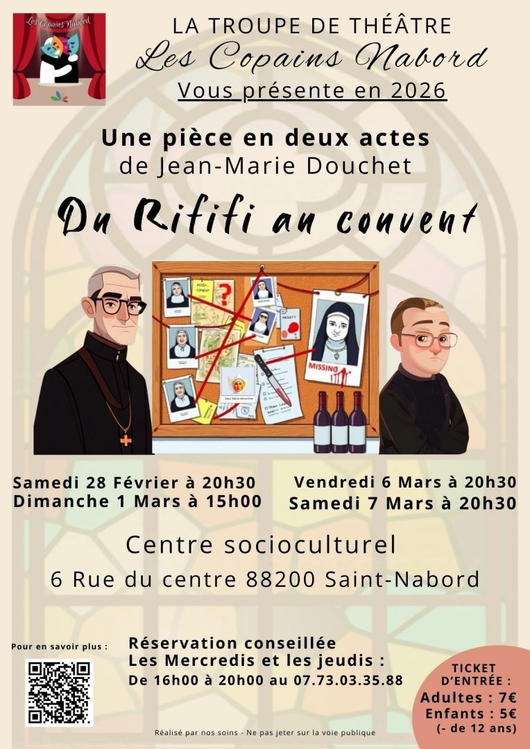La petite troupe de théâtre Les Copains Nabord prépare un nouveau spectacle, « Du rififi au couvent », une comédie en deux actes de Jean-Marie DOUCHET.