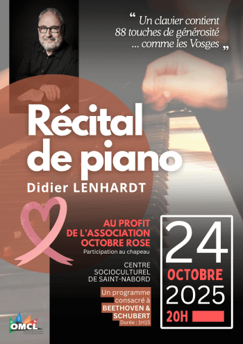 Il donnera un récital (participation au chapeau) au profit de l'association « Octobre rose » dans un programme consacré à Beethoven et Schubert.